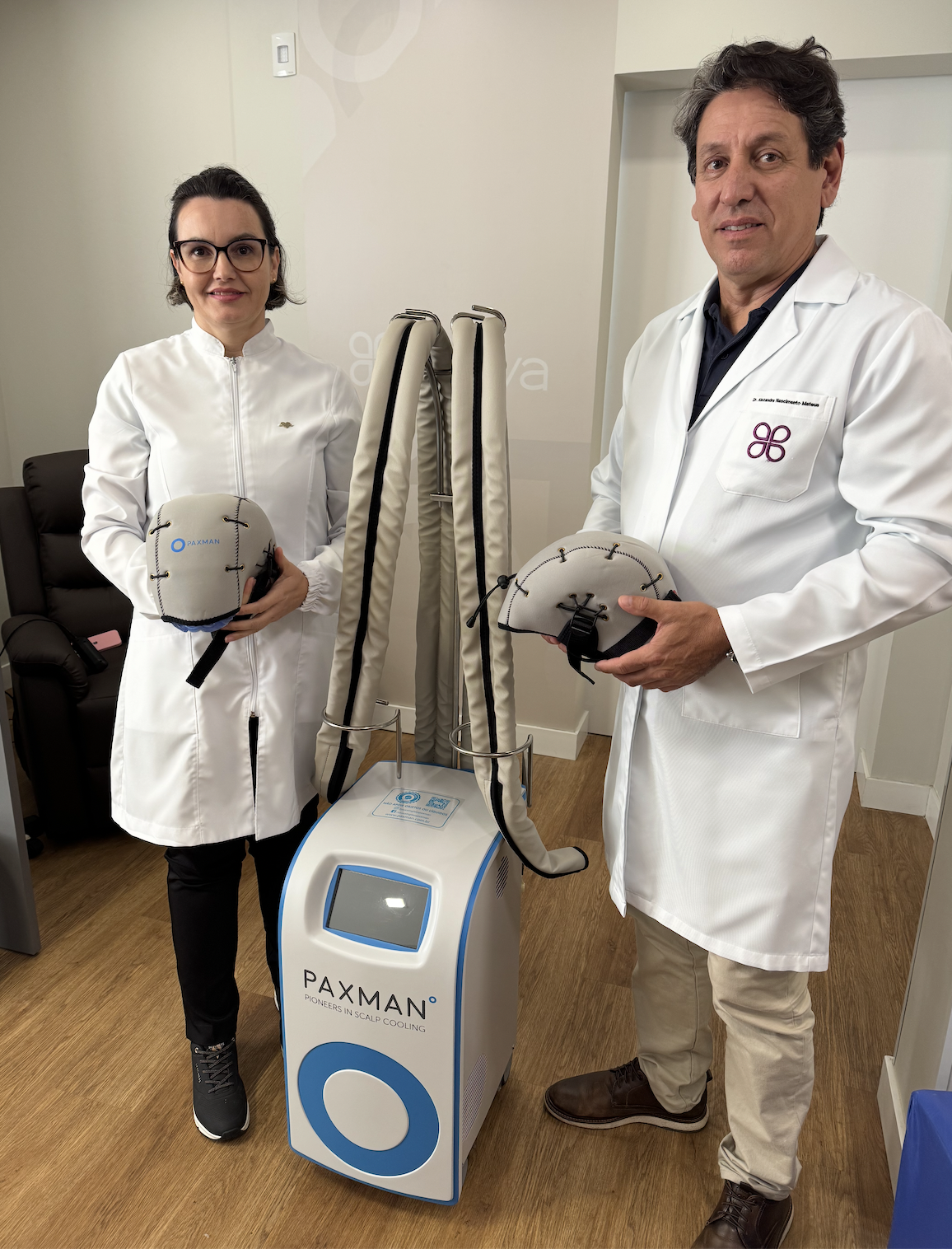 Enfermeira Daiana e Dr Alexandre Mateus recebendo a Touca Inglesa Paxman. Receber...